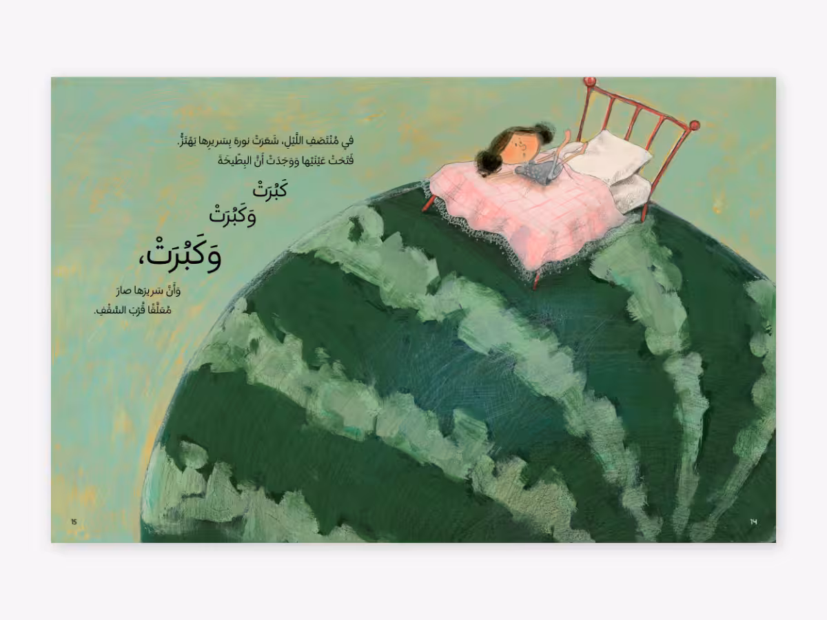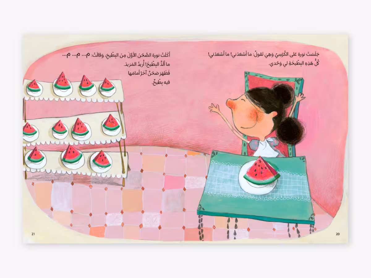 البطيخ هو طعام نورة المفضل. في أحد الأيام، خبأت بطيخة كبيرة تحت سريرها لتأكلها كلها وحدها بعد أن يخلد الجميع إلى النوم.
