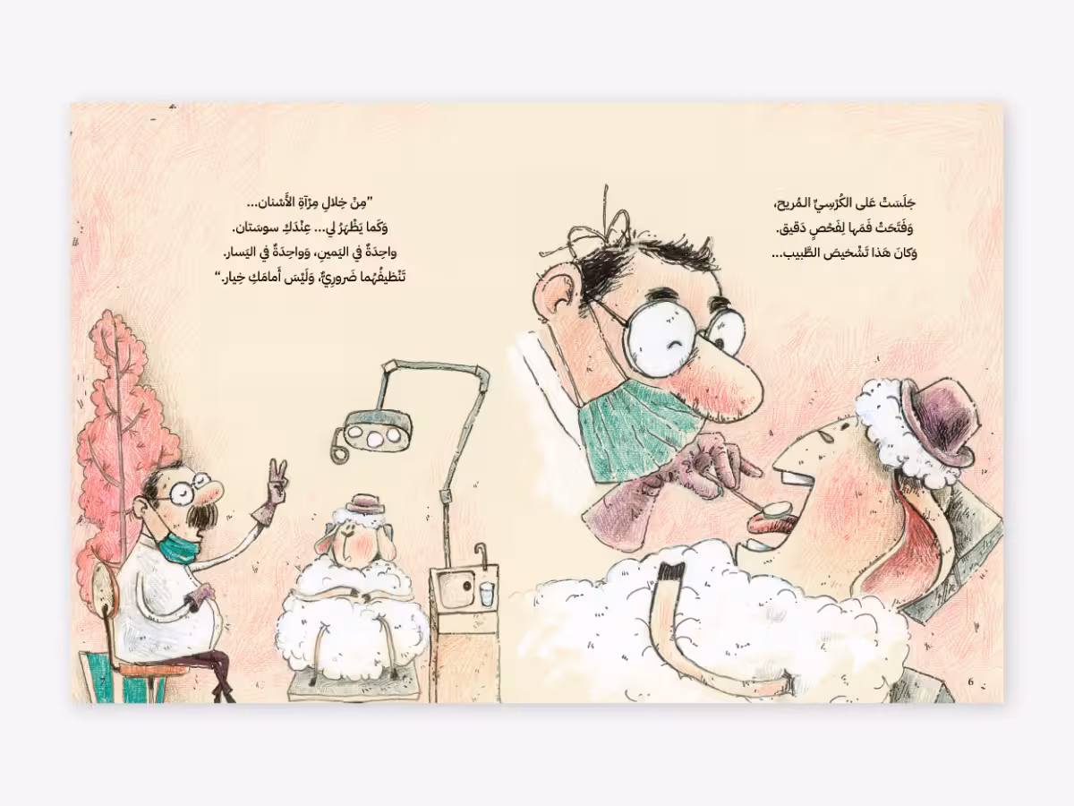 يتم فحص كل خروف بدوره، ويشخص طبيب الأسنان مشكلته ويعالجها، ثم ينطلق الخروف سعيدًا. ويتعرف الطفل على الأدوات التي يستخدمها طبيب الأسنان، ويتعلم عن مشاكل الأسنان المختلفة التي يعاني منها الناس، وكيف يمكن لطبيب الأسنان علاجها.