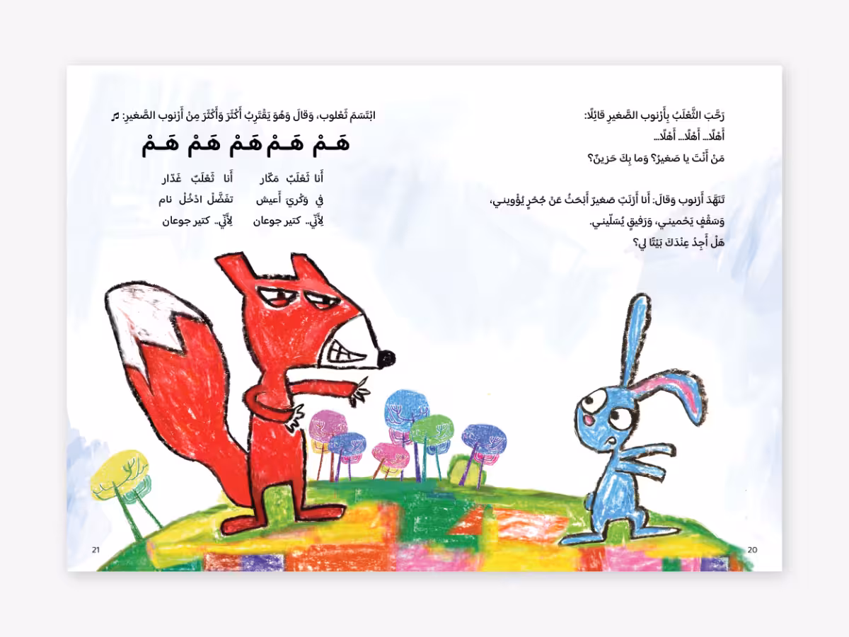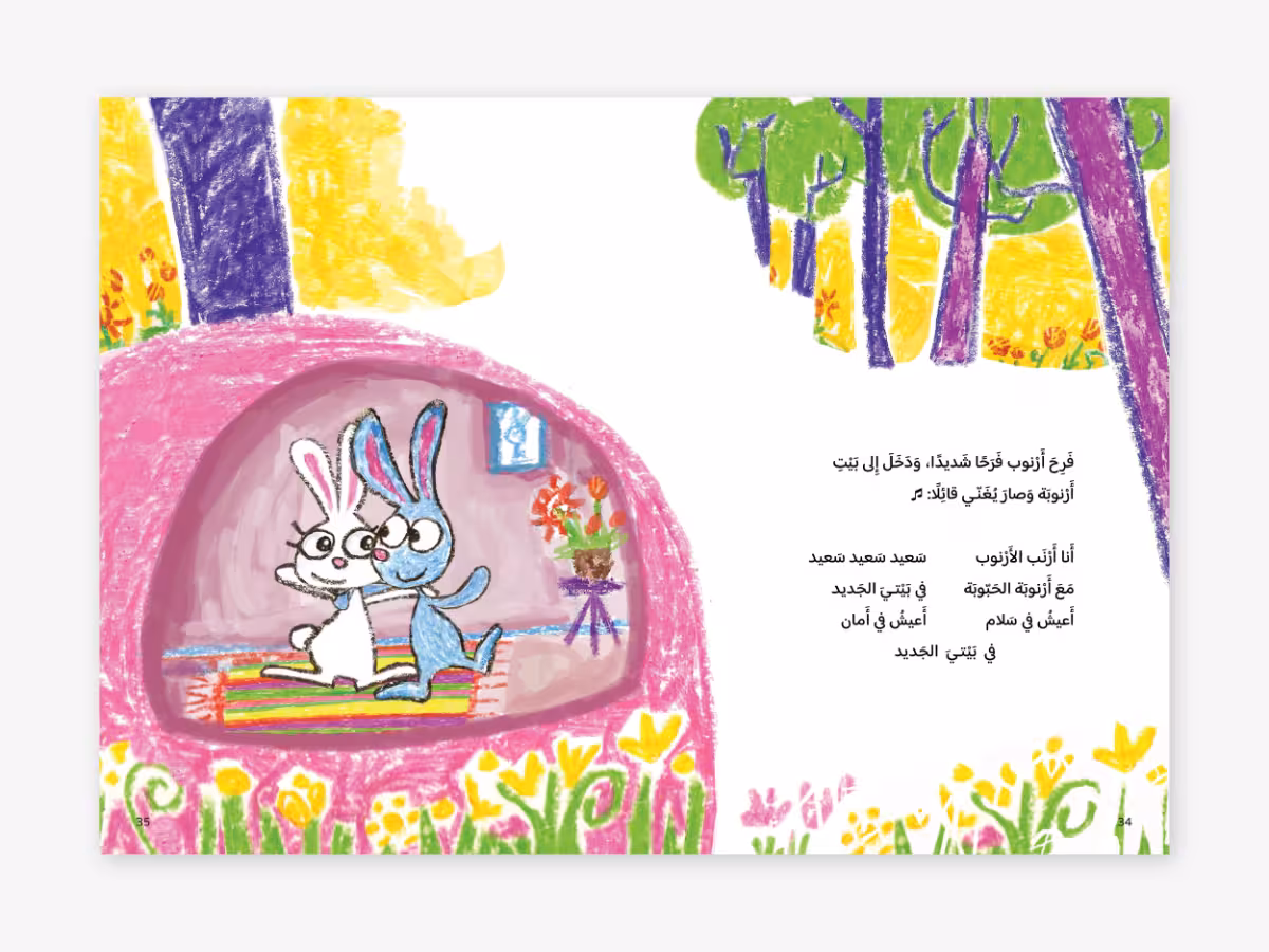 The children learn the names for the different homes of different animals, the sounds and character traits. The Arnoub song is part of the narrative of the story, flows with it and encourages the children to sing along.