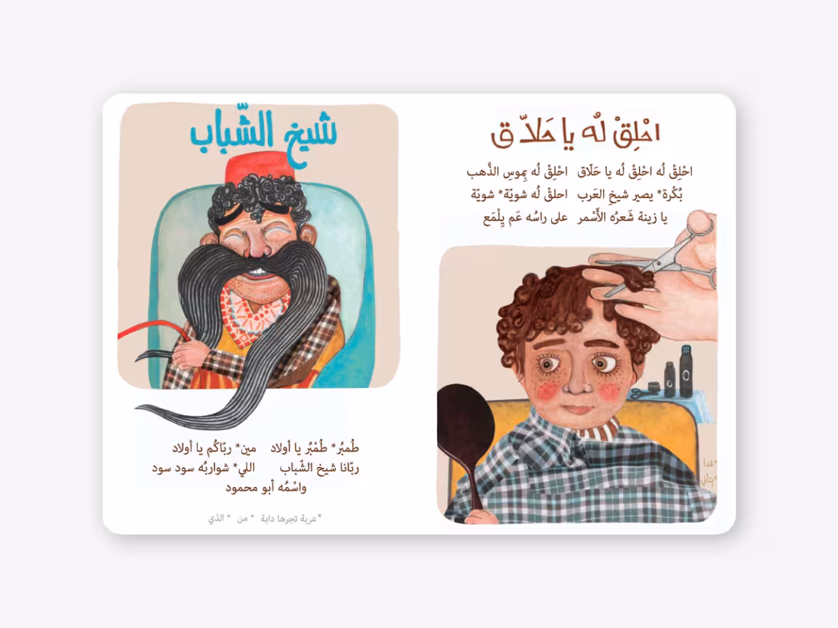 Another rhyme that is connected to an occasion is “The Barber” , it is usually recited by the proud mother or grandmother to celebrate the first hair-cut. The mother shows her love and future aspirations for her child as she hopes that one day he will become the Sheikh of all Sheikhs.