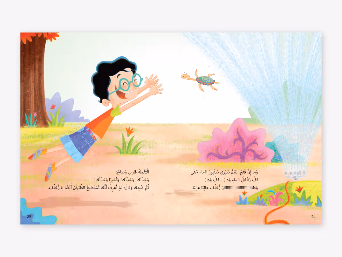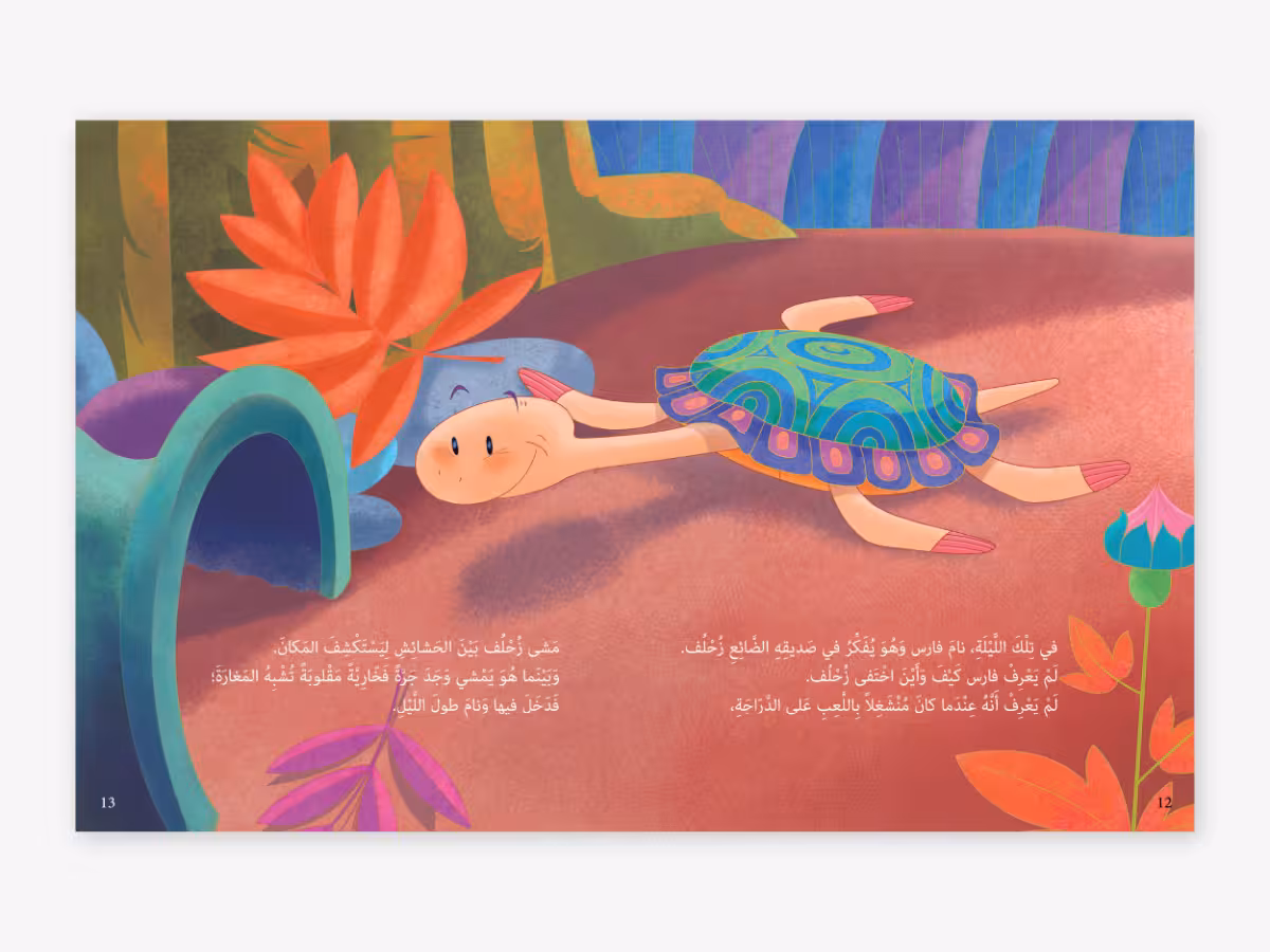 He calls the turtle Zohlof and has a lot of fun playing with him. One day Zolof wanders off in the garden and Fares is upset and sad when he cannot find him. Zohlof has an adventure on his own in the big garden but he soon gets hungry.