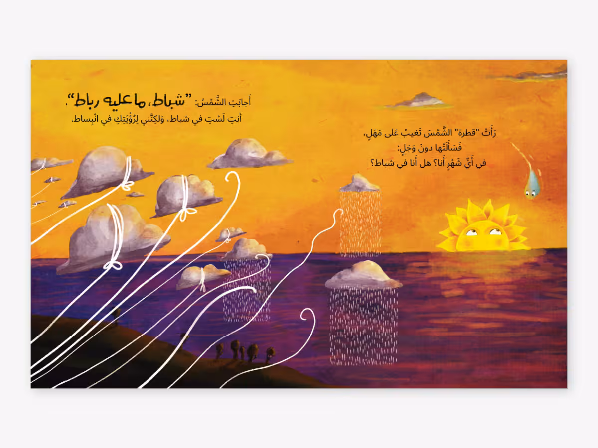A raindrop falls from a cloud on the ground! She asks everyone she meets the same question: What month am I? This story revives popular proverbs about the months of the year with wonderful illustrations that tickle the child’s mind and senses.
